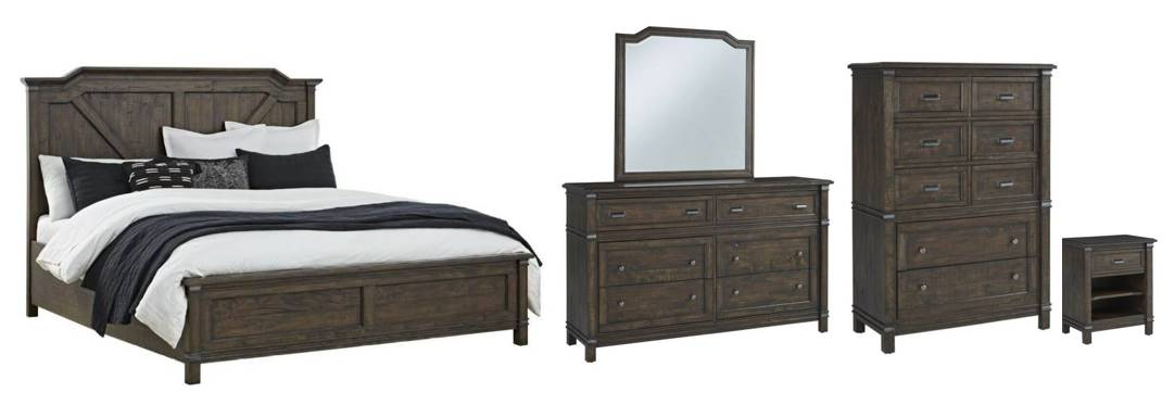 Set Includes: King bed, dresser, mirror, nightstand and chest
